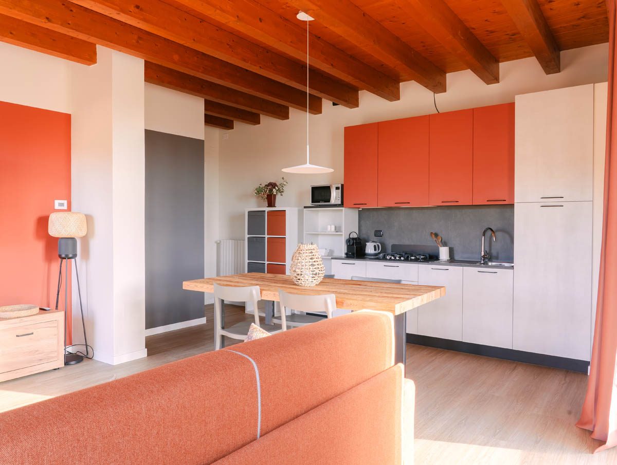The spacious living area with an open-plan kitchen is the heart of the home: a convivial space to relax, cook together, or simply enjoy the natural light streaming through the large windows.